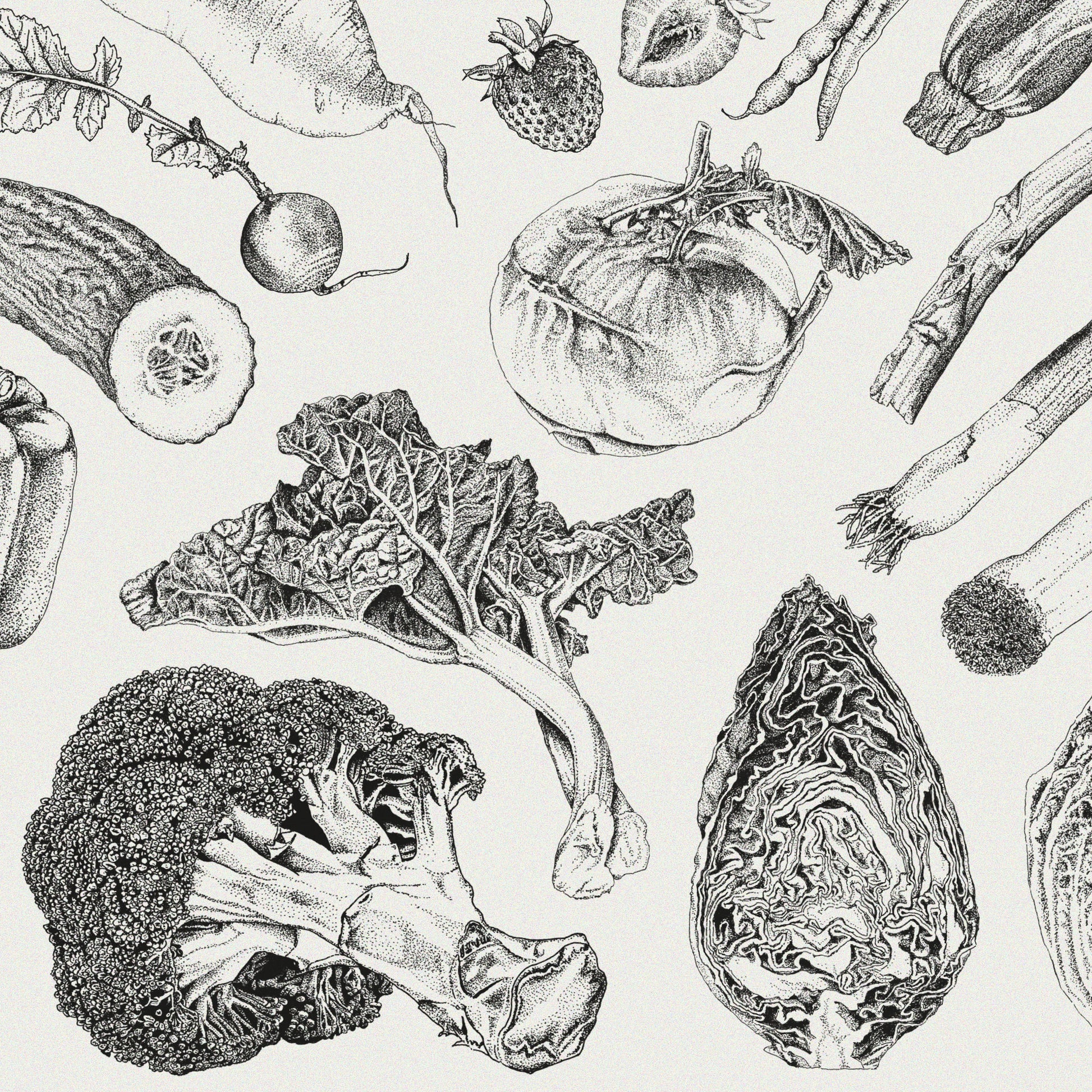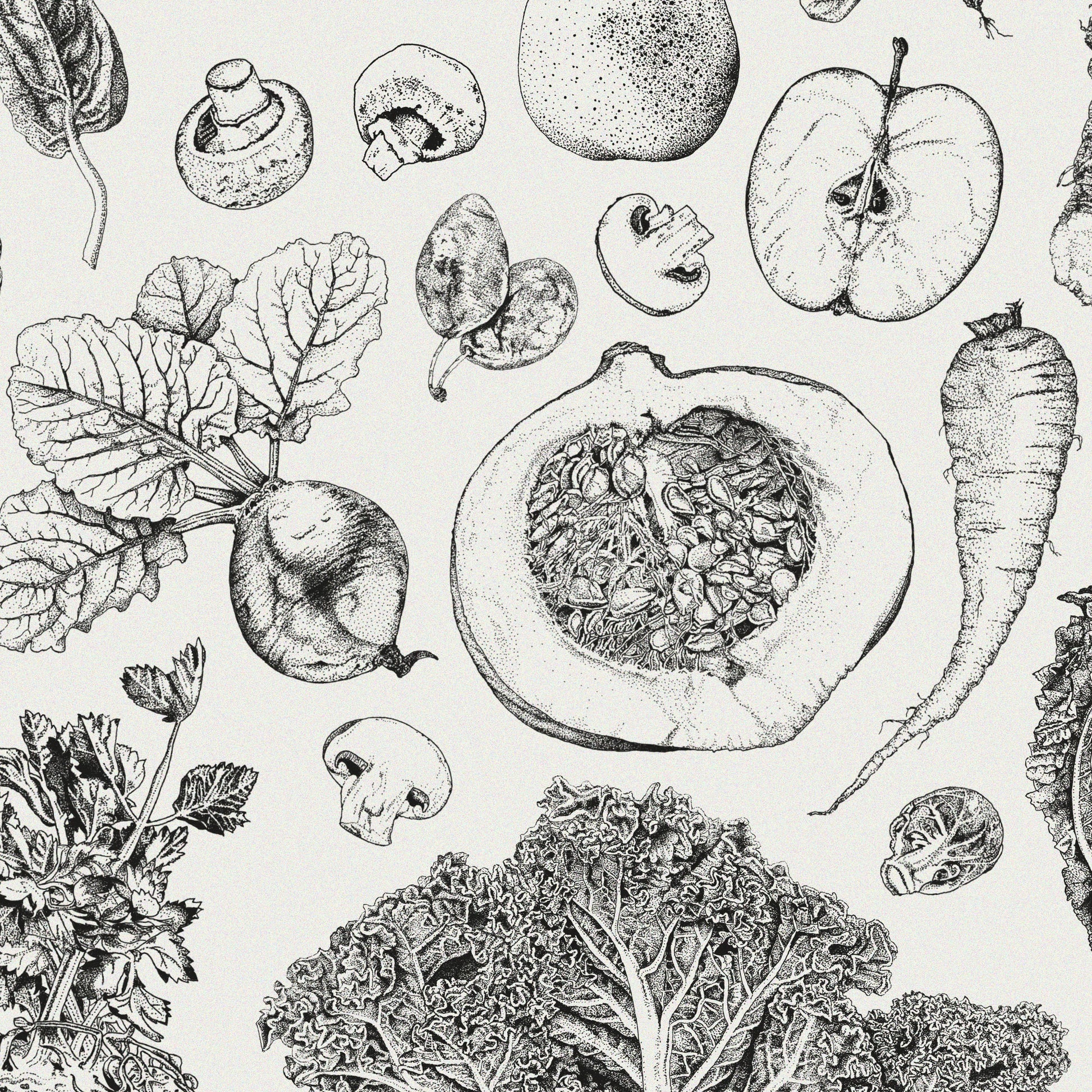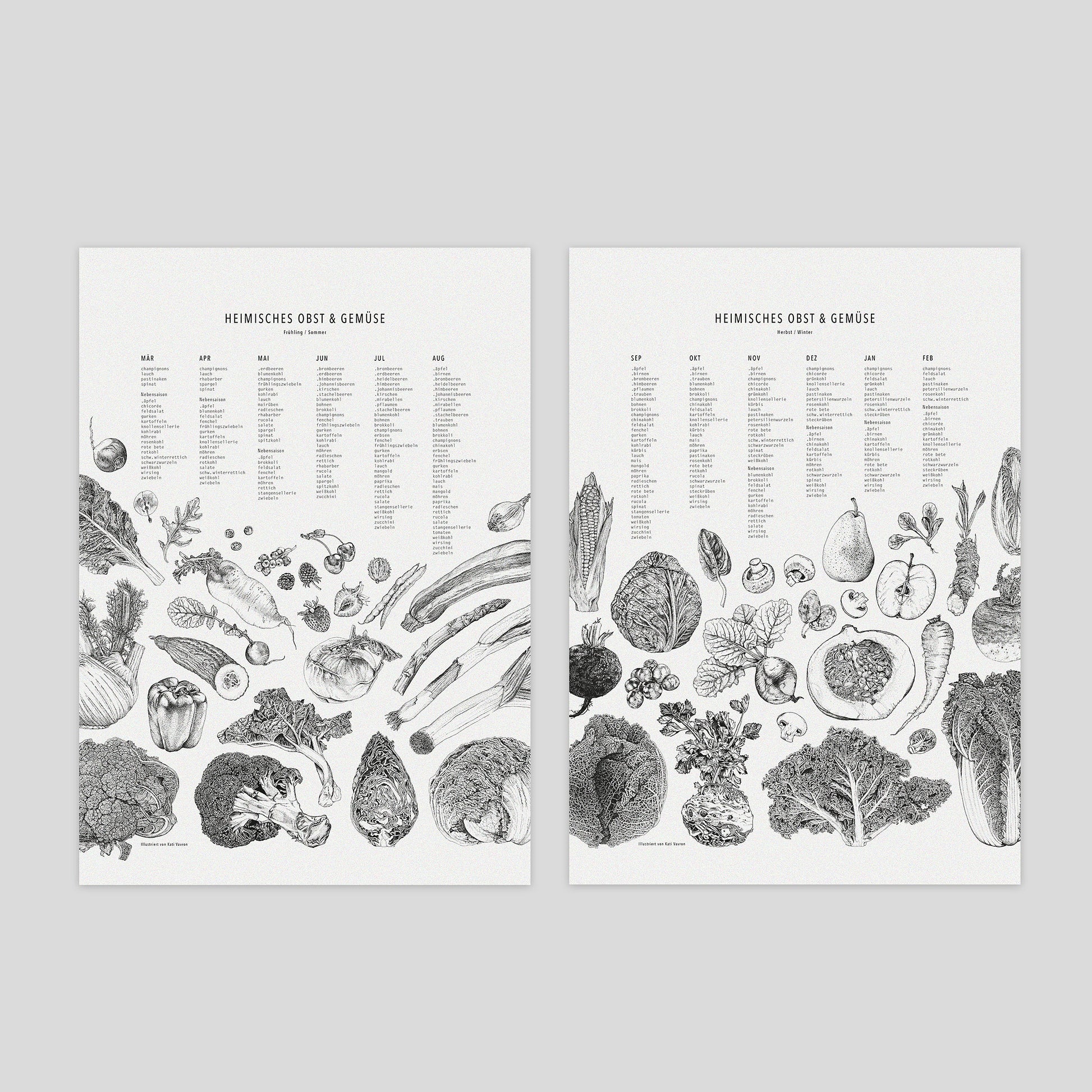 Es ist ein “Wende-Kalender”, d.h. auf der einen Seite sind die Frühling- und Sommermonate aufgeführt – auf der Rückseite findet ihr dann die Herbst- und Wintermonate. Je Monat wird das regionale Obst und Gemüse Deutschlands angezeigt – aufgeteilt in Haupt- und Nebensaison. So kannst du dich beim Kochen inspirieren lassen und nachhaltig einkaufen. Alle Obst- und Gemüsesorten sind jeweils darunter in den Collagen kunstvoll zusammengestellt. Die insgesamt 75 Fineliner-Illustrationen habe ich innerhalb von zwei Jahren im “Dots and Lines”-Stil gezeichnet.
