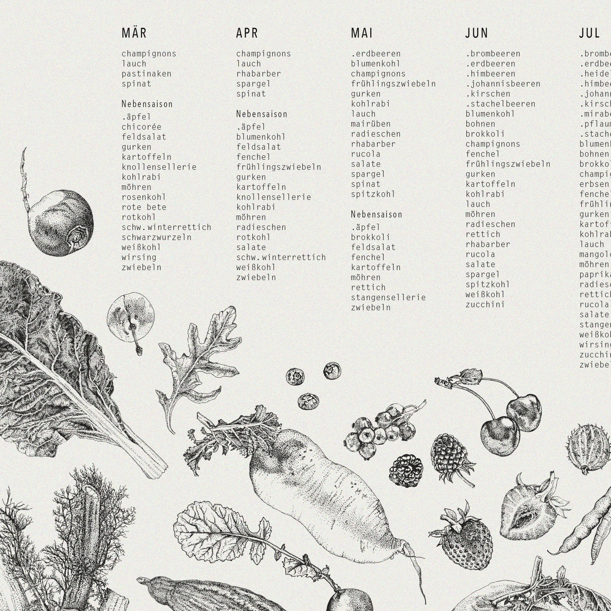 Künstlerischer Saisonkalender mit liebevoll von Hand gezeichneten Illustrationen
